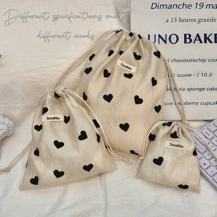 1pc Mini Drawstring Storage Bag, Black Heart Pattern, Fabric Organizer For Miscellaneous Items And Small Objects, Portable Toiletry Bag, Lightweight Foldable Design,Makeup Bag,Travel Essential