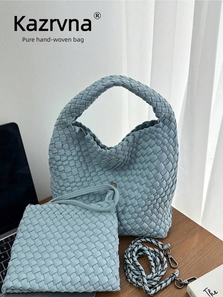 3 Pieces Sky Blue Fashionable Dopamine Style Minimalist Faux Handbag,Neoprene Luxury Portable Foldable Plaid Women Shoulder Bag, Braid Bag Large Capacity For Outdoors&Travel&Holiday&Shopping,For Lady&Woman&Female