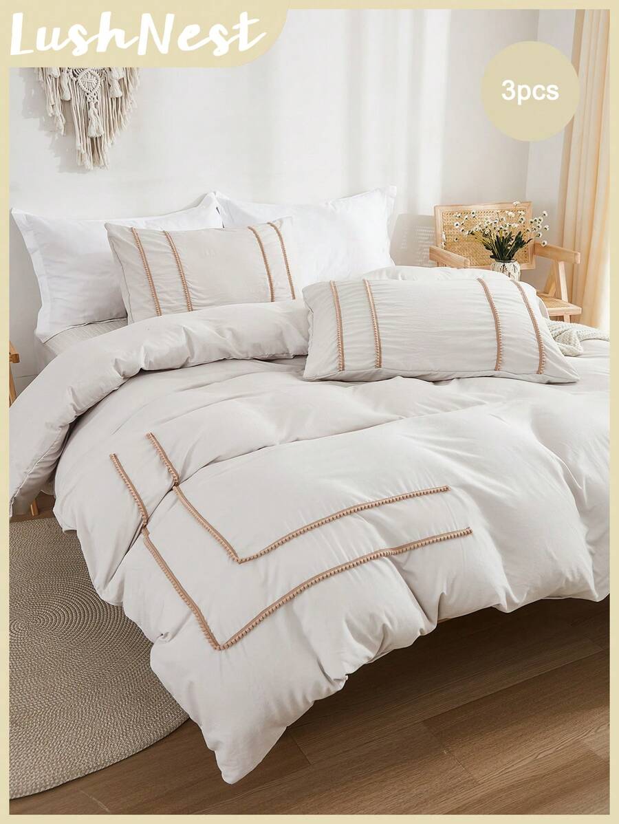 Beige Bedding Pom Pom Duvet Cover Set Boho Farmhouse Bedding Set Queen,King With Zipper Closure 3 Pieces Mini Pom Pom Decor Beige Comforter Cover Soft Microfiber Duvet Cover For Boys Girls 1 Duvet Cover 2 Pillowcases No Comforter,For All Seasons