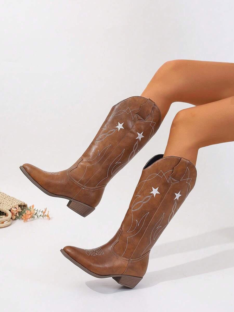 Fall/Winter 2025 Embroidered Random Asymmetric Chunky Heel Riding Boots Western Style Women Fashion Boots,Cowboy Boots