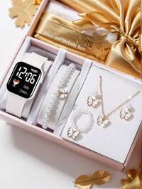Girls' Fashionable And Elegant LED Heart-Shaped Digital Watch And Butterfly-Shaped Jewelry Set Including Bracelet, Necklace, Ring, Earrings, Suitable For Girls, Students, Daily Occasions Like School, Parties, Travel, Perfect Gift For Friends, Birthday, Christmas And Other Holidays 6/1pc Girls Fashion Elegant Classic LED Digital Display Square Electronic Watch, Suitable For Girls, Comes With Bracelet, Necklace, Ring, Earring Set, Suitable For Students, Perfect For Back To School, Parties, Travel And Daily Life, Great Gift For Friends, Birthday, Graduation