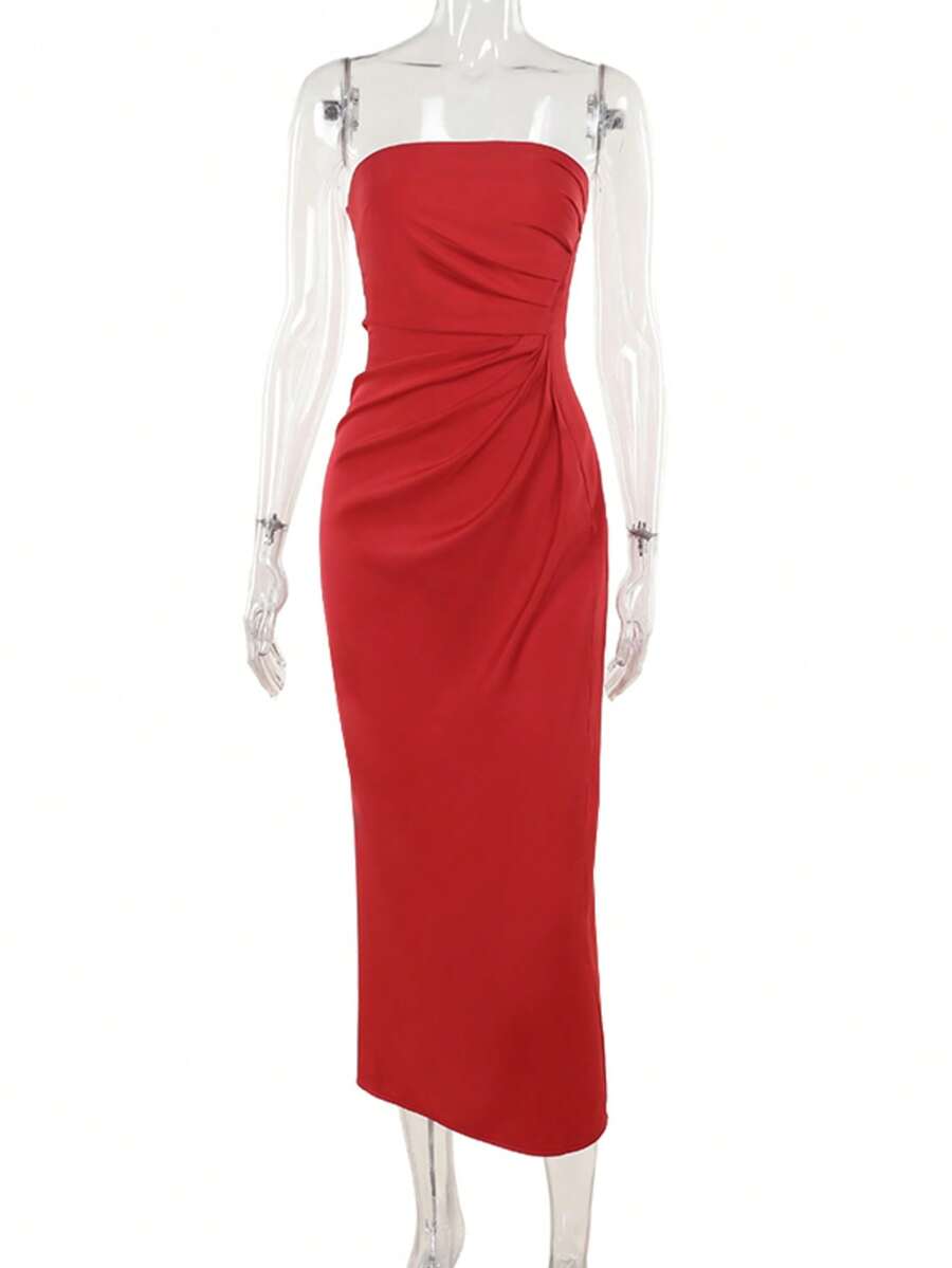 WOWDARK Women's Elegant Draped Bodice Satin Sleeveless Midi Dress, Autumn