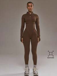 UONNOU SPORTSWEARUONNOU 1-Piece Jumpsuit, Peach Color Butt-Lifting Slimming, Full Body Shaping, Half-Zip Collar, Long Sleeve With Thumb Hole, Suitable For Sports, Skiing, Cycling, Fitness, Yoga, Indoor/Outdoor Activities, Casual Wear, Seamless Ribbed Knit Fabric, Autumn/Winter