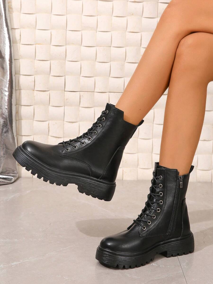 Women's Side Zipper Thermal Lined Lace-Up Black Biker Boots, Comfortable Warm Solid Color Boots For Autumn/Winter, Suitable For Pairing With Hoodies, Fall Outfits, Valentine's Day, Women's Black Sneakers, Women's Halloween Costumes, Women's Ankle Boots, Long Black Boots, Christmas Gifts, New Fashionable Autumn Style, Black High Heel Boots, Run Small By Half A Size